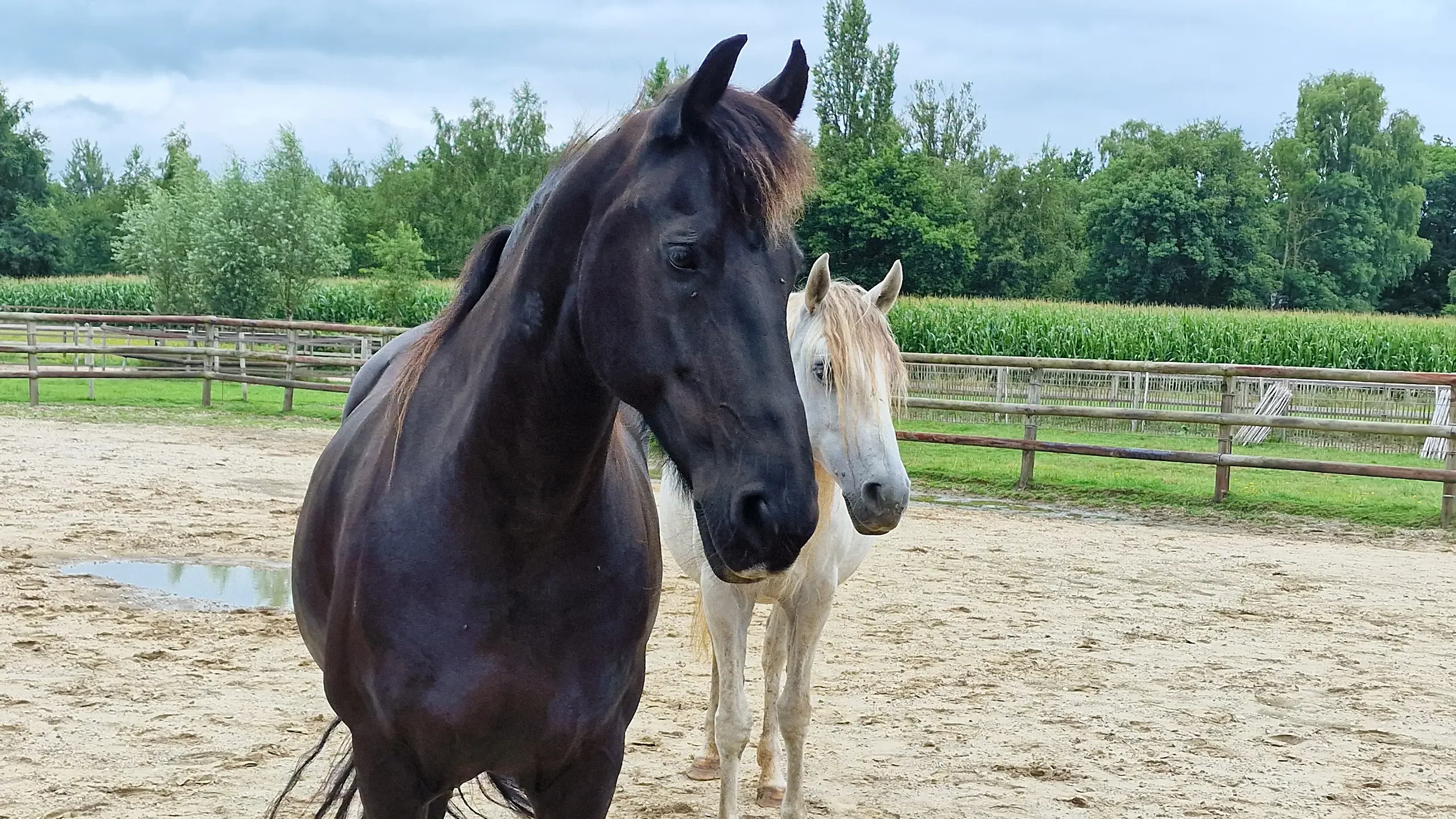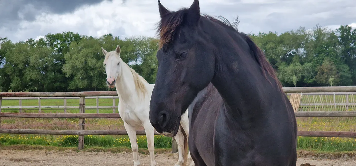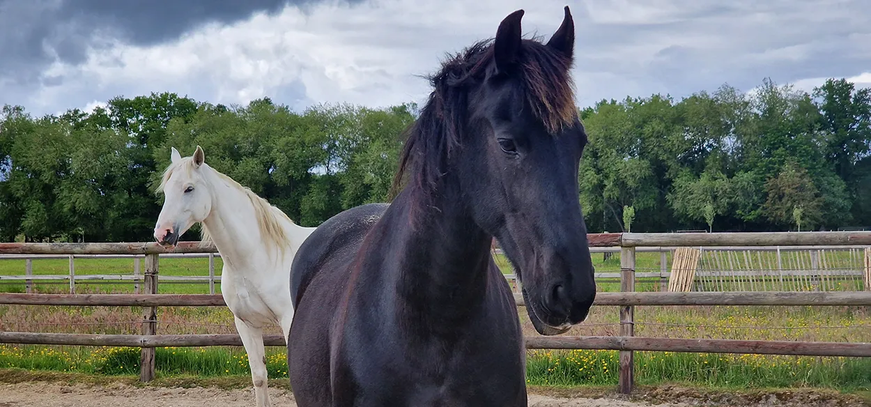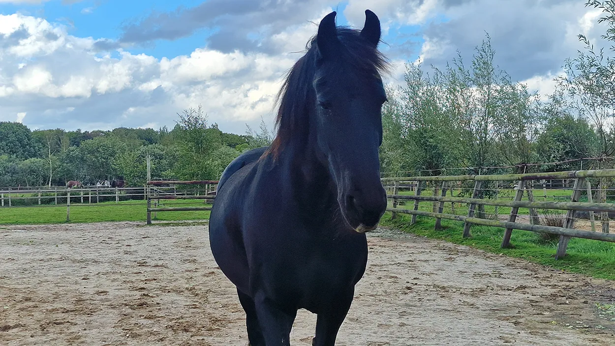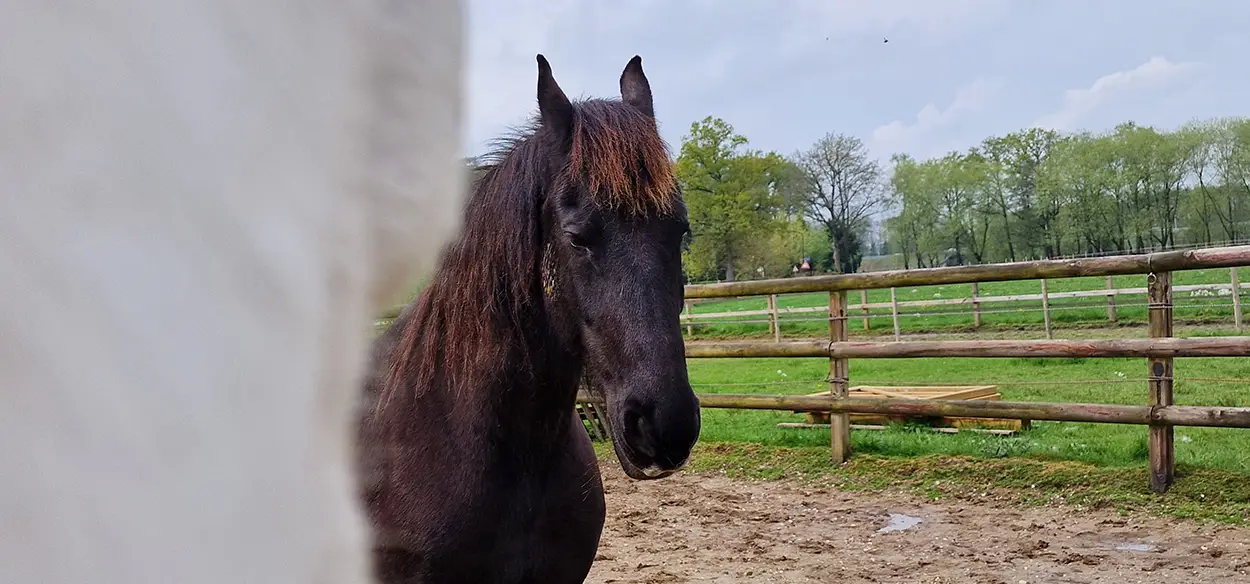 In de vroege ochtend, als de mist nog over de velden sluimert, verschijnt Noir. Geen bombarie, geen galopperende entree, alleen kalme aanwezigheid. Ze staat daar, stil en zelfverzekerd. Noir dringt zich niet op. Ze hoeft niets te bewijzen. Ze ís er gewoon, als een anker in een wereld vol prikkels.